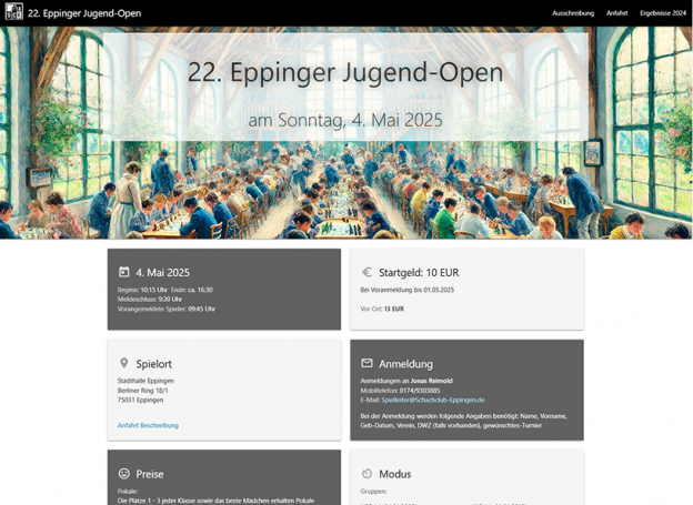 As my son started playing this chess tournament last year I was used to  go through this charming retro page to look up the results on this page. It was build with Microsoft FrontPage 10 years ago. Its nice blue (#0000ff) background and a yellow (#00ffff) text were almost OK. What I could not resist was a constantly running line (remember MARQUEE tag?) …